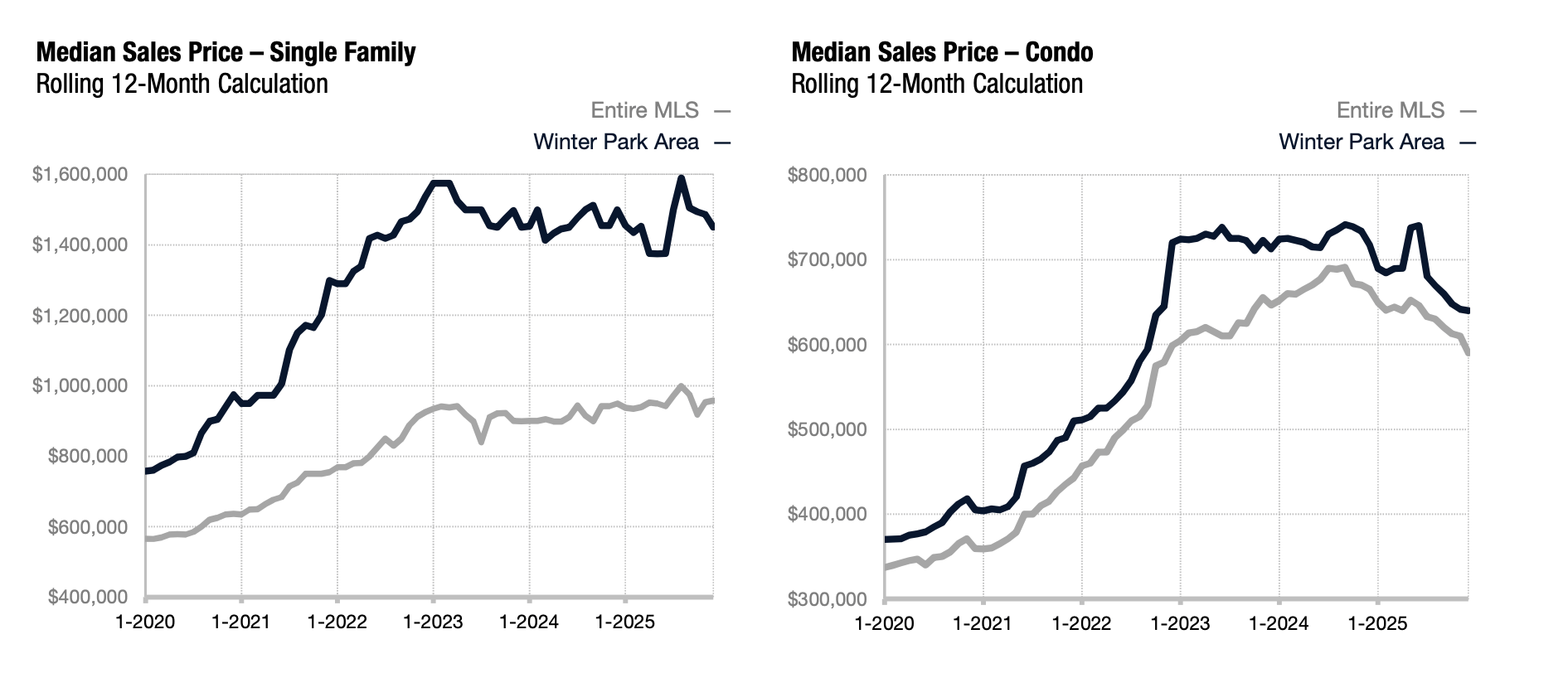 As of January 21st, 2026, the Winter Park median sales price is $1.6M for single family homes and $649,000 for condos. Reach out to me for the most recent market report with data such as median and average sales price, days on market, months supply of inventory and more.